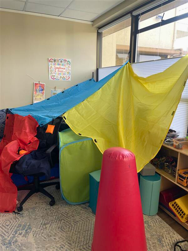 We keep a shelf out of children’s reach stocked with therapist-only items like wet wipes, extra water, and paper towels. This makes cleanup and transitions much easier while keeping supplies safely managed.